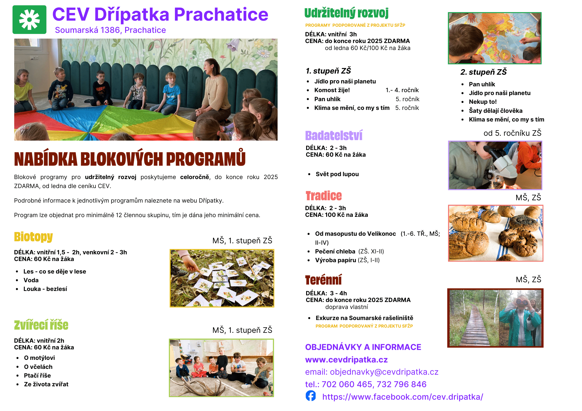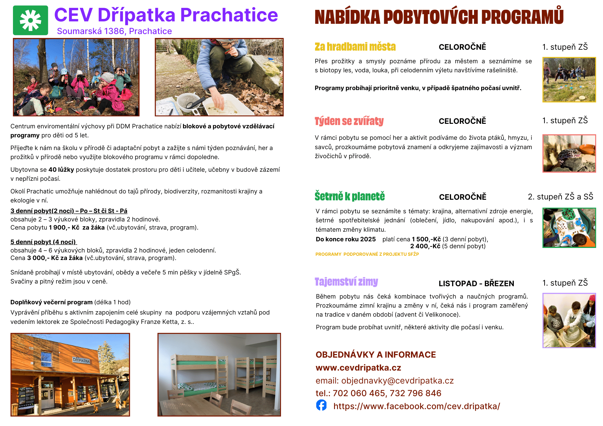 CEV Dřípatka poskytuje celoroční ubytování s výukovými programy skupinám z řad mateřských škol, třídním kolektivům základních, středních a vysokých škol a dalším organizovaným skupinám (např. sportovní oddíly, neziskové organizace?).