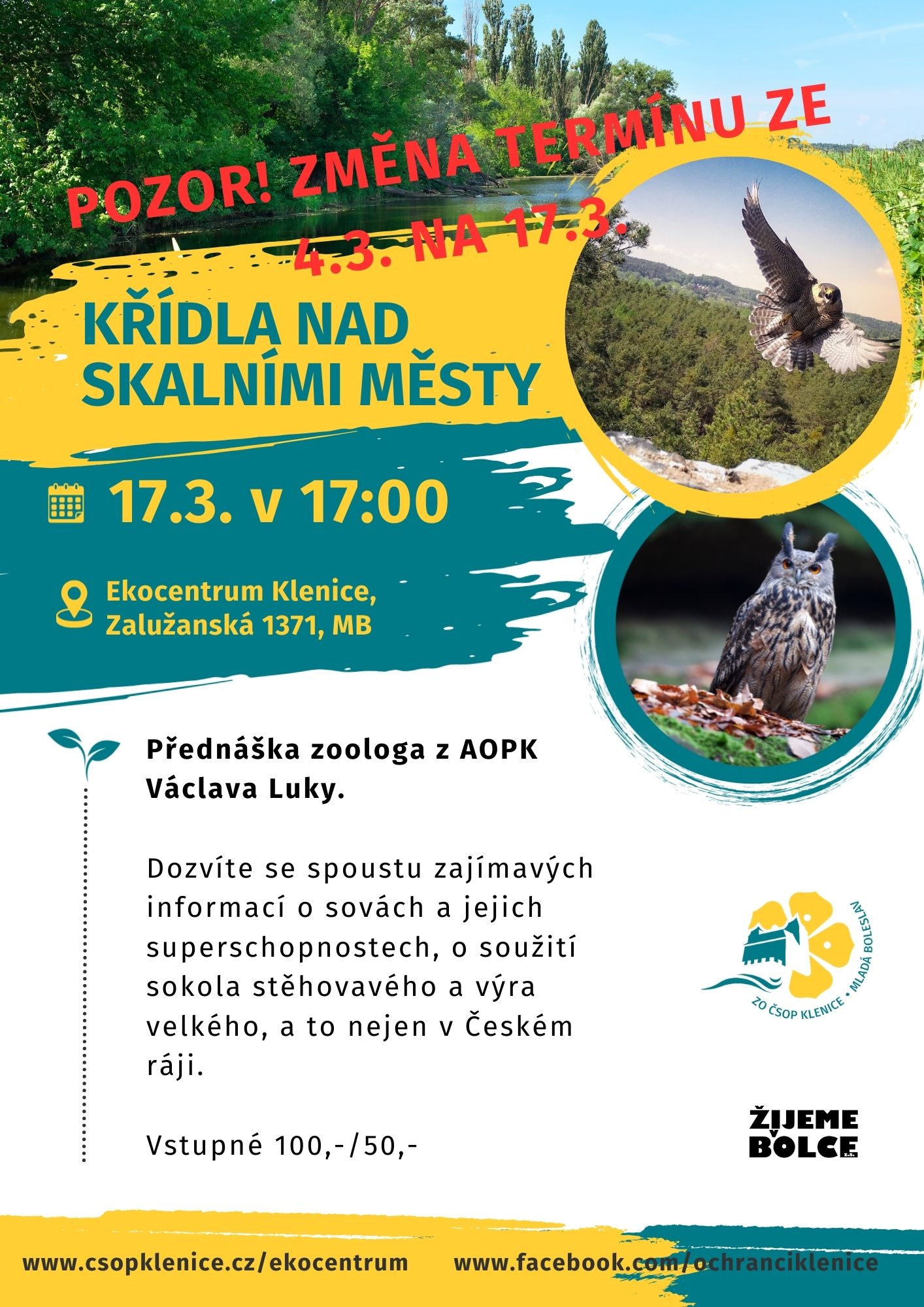 Přednáška zoologa z AOPK Václava Luky. Dozvíte se spoustu zajímavých informací o sovách a jejich superschopnostech, o soužití sokola stěhovavého a výra velkého, a to nejen v Českém ráji. Vstupné 100,-/50,-
