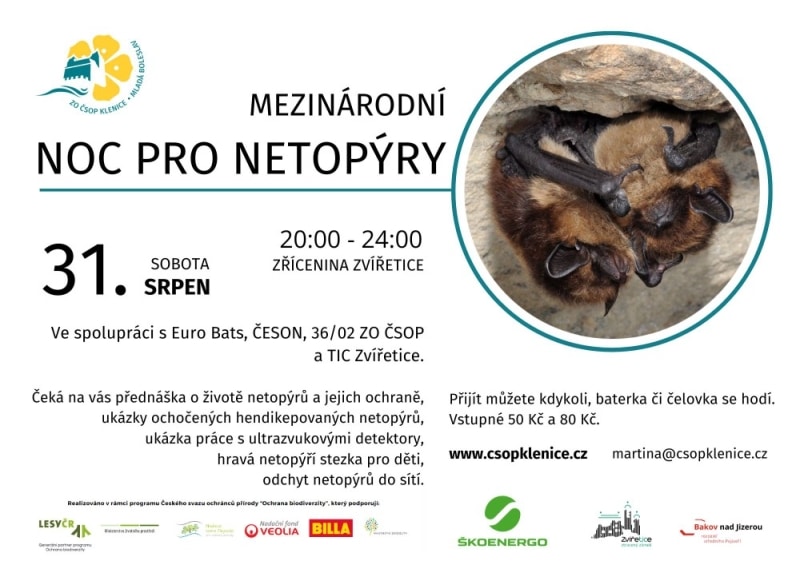 Chystá se další Mezinárodní noc pro netopýry. Čeká na vás přednáška o životě netopýrů a jejich ochraně, ukázky ochočených hendikepovaných netopýrů, ukázka práce s ultrazvukovými detektory, hravá netopýří stezka pro děti, odchyt netopýrů do sítí.