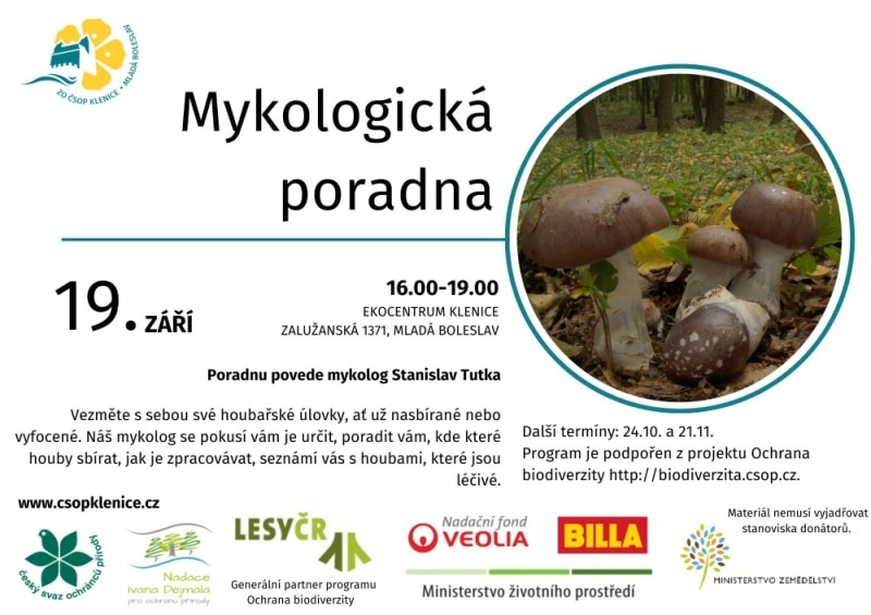 Mykologická poradna v Ekocentru Klenice v Mladé Boleslavi. Vezměte si s sebou své houbařské úlovky. Mykolog Stanislav Tutka vám poradí, o jaké houby se jedná a jak je nejlépe zpracovat.