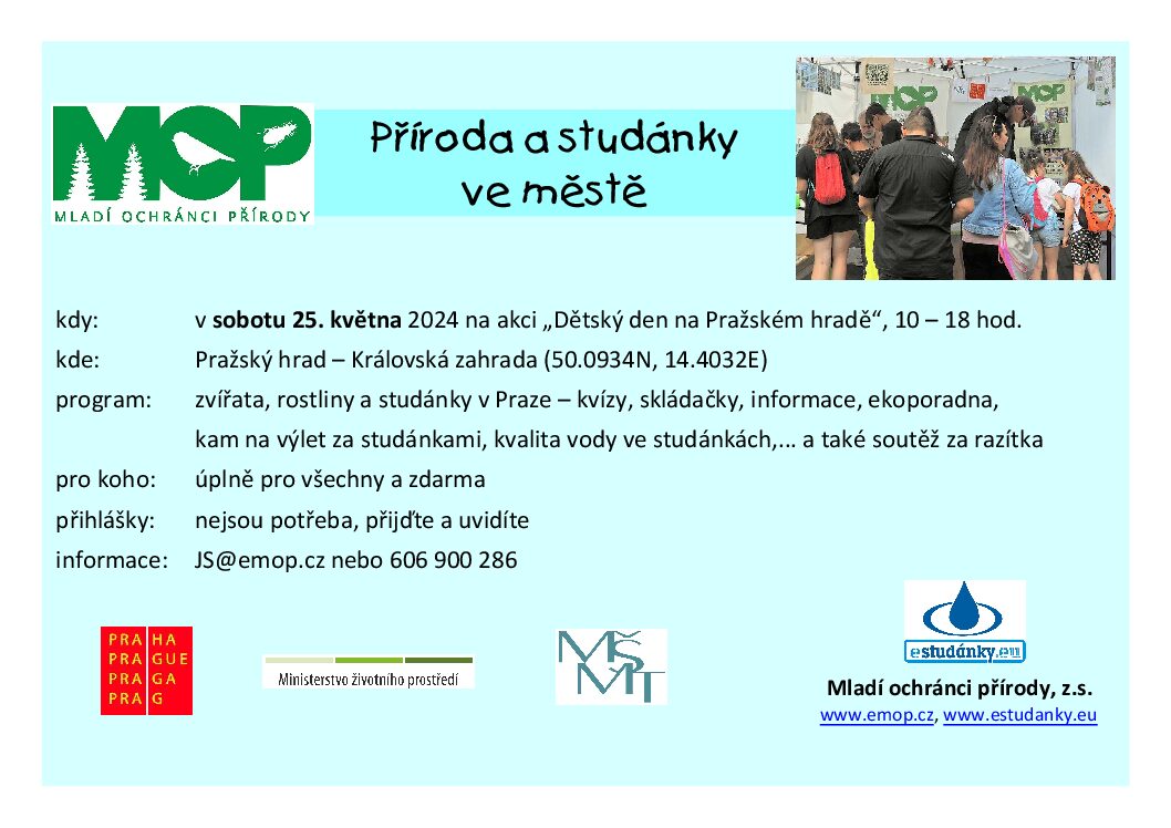 Stan spolku Mladí ochránci přírody, z. s. přímo v Královské zahradě bude zaměřený na přírodu v Praze. Najdete tam kvízy, skládačky, informace o studánkách… Ano, i v Praze jsou studánky! Chcete vědět kde? Nebude chybět ani malá soutěž o razítka.