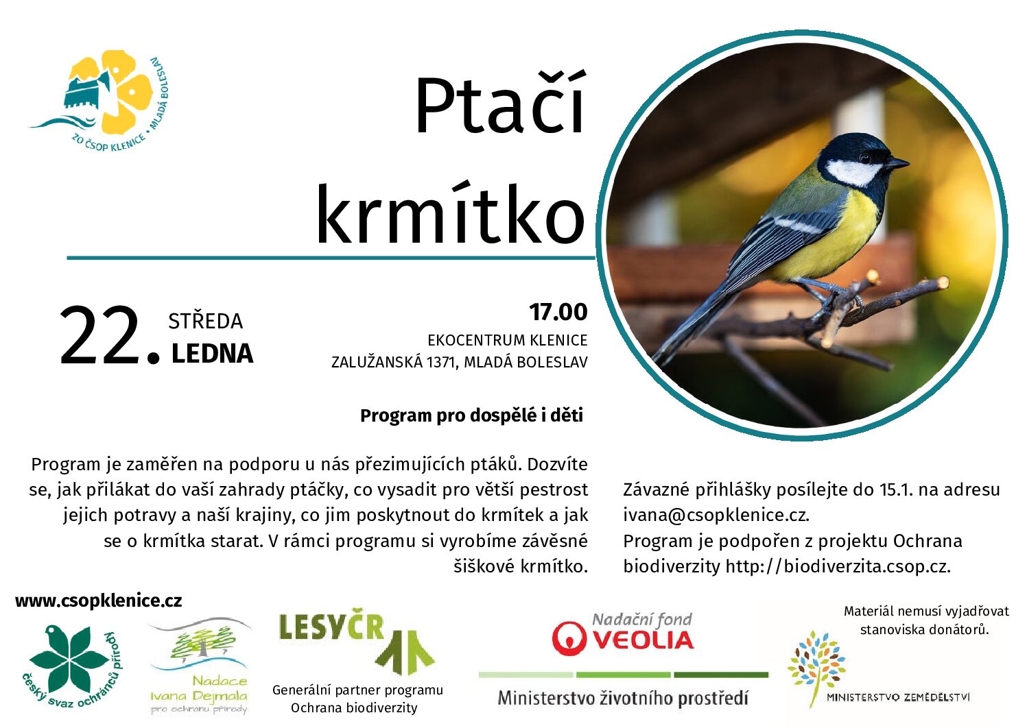 Program je zaměřen na podporu u nás přezimujících ptáků. Dozvíte se, jak přilákat do vaší zahrady ptáčky, co vysadit pro větší pestrost jejich potravy a naší krajiny, co jim poskytnout do krmítek a jak se o krmítka starat. V rámci programu si vyrobíme závěsné šiškové krmítko. Závazné přihlášky posílejte do 15.1. na adresu ivana@csopklenice.cz.