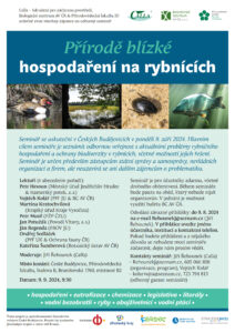 Calla, Biologické centrum AV ČR a Přírodovědecká fakulta JU pořádají v pondělí 9. září 2024 odborný seminář „Přírodě blízké hospodaření na rybnících“. Akce proběhne od 9:30 v prostorách PřF JU a zaměří se na význam rybníků, jejich živinovou zátěž, kontrolu rybničního hospodaření nebo různé důležité skupiny organismů.