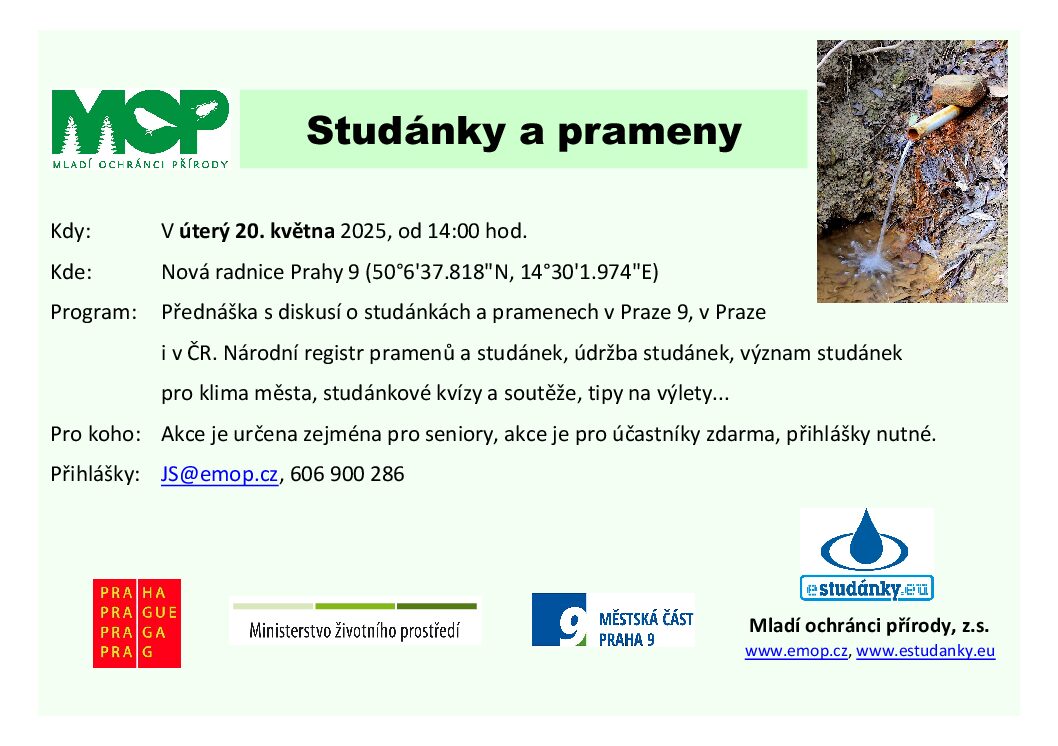Co je a co není Národní registr pramenů a studánek www.estudanky.eu. Kdo a jak může přidávat studánky do registru s více než 15 tisíci studánek v České republice. Jak a proč o studánky pečovat, jejich význam pro klima města i pro poutníky. Kvalita vody a její zjišťování. Studánkové kvízy a soutěže, tipy na výlety… Dlouhodobá studánková návštěvnická soutěž o drobné věcné odměny.