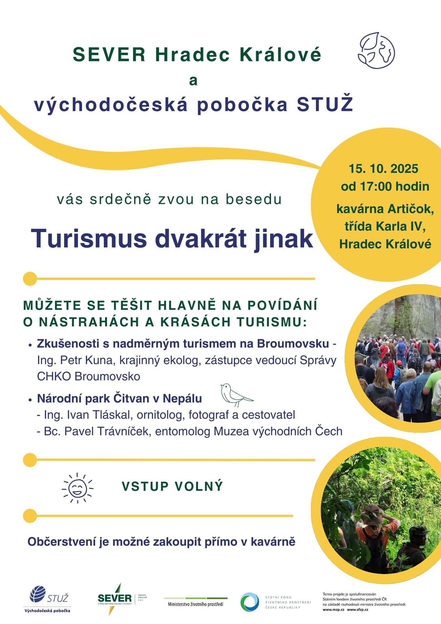 Přijďte si poslechnout a popovídat o krásách a nástrahách turismu! KDY: 15. 10. 2025 od 17h. KDE: Kavárna Artičok, třída Karla IV. Můžeme se těšit na povídání o Národním parku Čitvan v Nepálu a o zkušenostech s nadměrným turismem na Broumovsku. To vše od zasvěcených odborníků. Leták ke stažení.