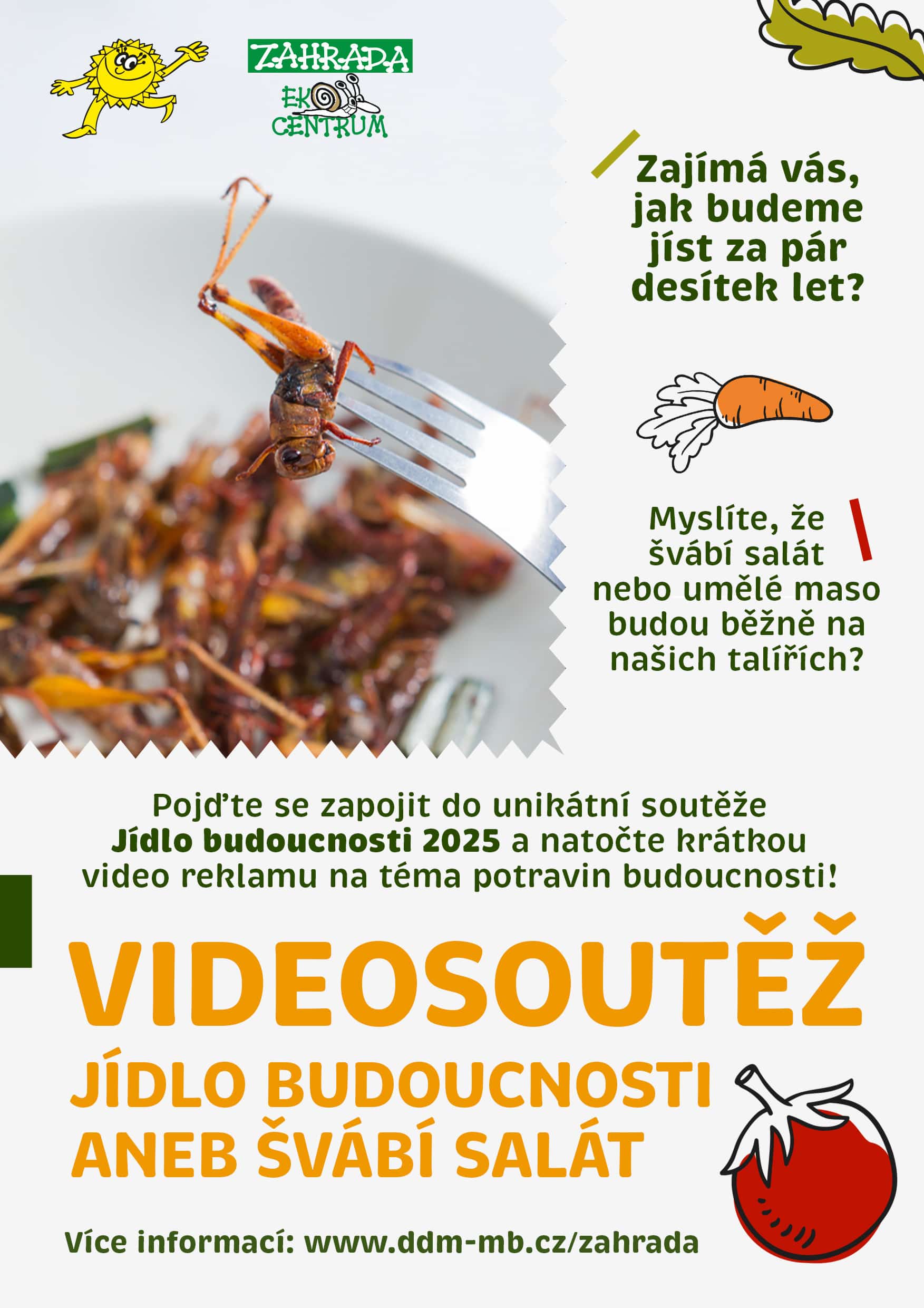 Zajímá vás jak budeme jíst za pár desítek let? Myslíte že hmyz, umělé maso nebo úplně jiná alternativa bude běžně na našich talířích? Zapojte se do soutěže Jídlo budocnosti a natočte krátkou videou reklamu na téma potraviny budoucnosti. Více informací na: www.ddm-mb.cz/zahrada