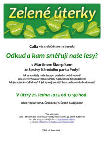 Lednová beseda z cyklu Zelené úterky bude o vývoji, současném stavu, ochraně a budoucnosti našich lesů. Svůj pohled představí entomolog Martin Škorpík ze Správy Národního parku Podyjí. Těšíme se na vás jako obvykle v českobudějovickém kulturním klubu Horká vana.
