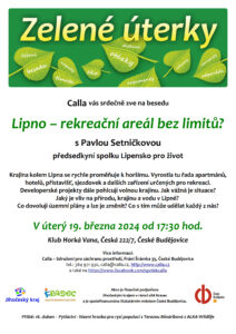 Krajina kolem Lipna se rychle proměňuje k horšímu. Vyrostla tu řada apartmánů, hotelů, přístavišť, sjezdovek a dalších zařízení určených pro rekreaci. Developerské projekty dále pohlcují volnou krajinu. Jak vážná je situace? Jaký je vliv na přírodu, krajinu a vodu v Lipně? A co se s tím dá udělat? Přijďte se poučit a diskutovat na březnový […]