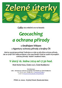 Milí příznivci Zelených úterků, zveme vás na první besedu z našeho cyklu v novém roce, tentokrát s názvem „Geocaching a ochrana přírody“. O tom, jak může hledání krabiček škodit nebo prospívat přírodě a její ochraně přijede v úterý 16. ledna povídat Ondřej Vítek z Agentury ochrany přírody a krajiny ČR. Beseda proběhne od 17:30 v českobudějovickém klubu Horká vana. Kešeři i mudlové vítáni.