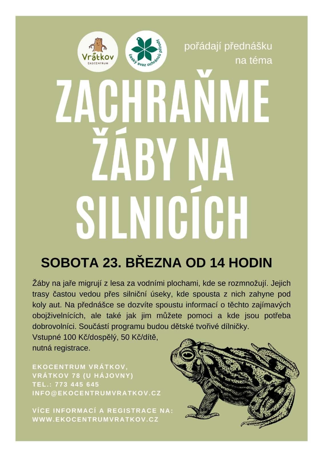 Žáby se s začínajícím jarem chystají objevovat vodní plochy. Ve velkém tedy migrují a jejich cestu často kříží silniční tahy. Pojďme se podívat blíže na život těchto obojživelníků. Jak je možné je chránit, kde je třeba pomoci? Přednáška ve spolupráci s ČSOP Vlašim a tvořivé dílničky. Více na stránkách ekocentrumvratkov.cz